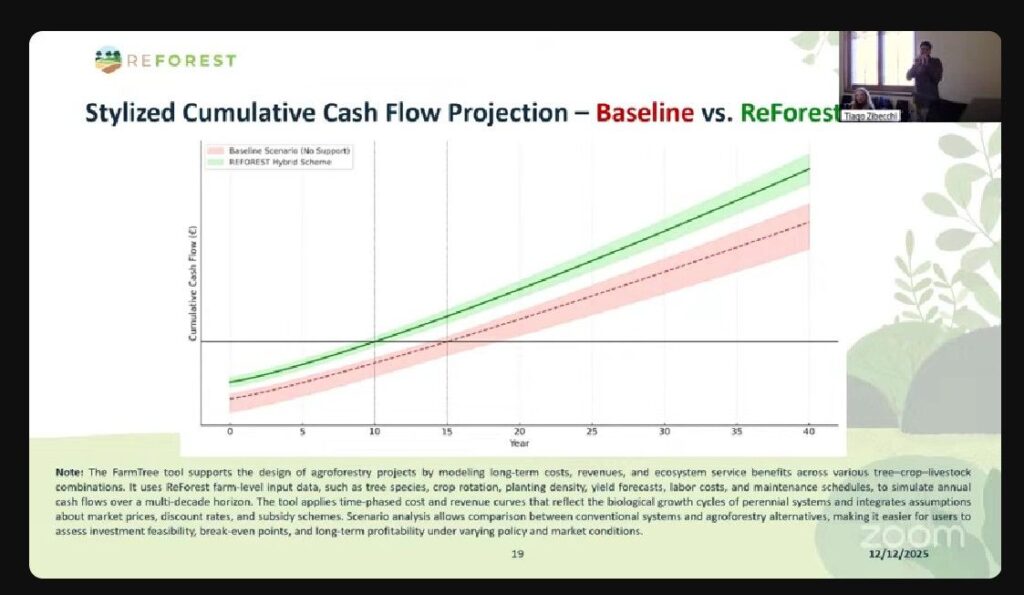 Dr. Anebagilu also introduced the Dynamic Management Tool, a probabilistic, farmer-centred decision-support model that tests agroforestry system performance under uncertainty. By modelling systems using real data from Living Labs in Germany, Belgium, and the UK, the tool demonstrates how different funding structures dramatically shape long-term viability.